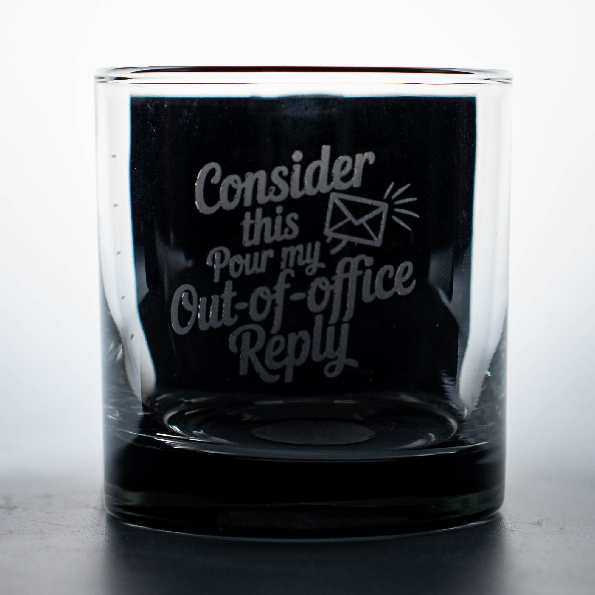 10 oz rocks glass with The 9-to-5 Pourcast engraving. White laser engraving on clear glass.