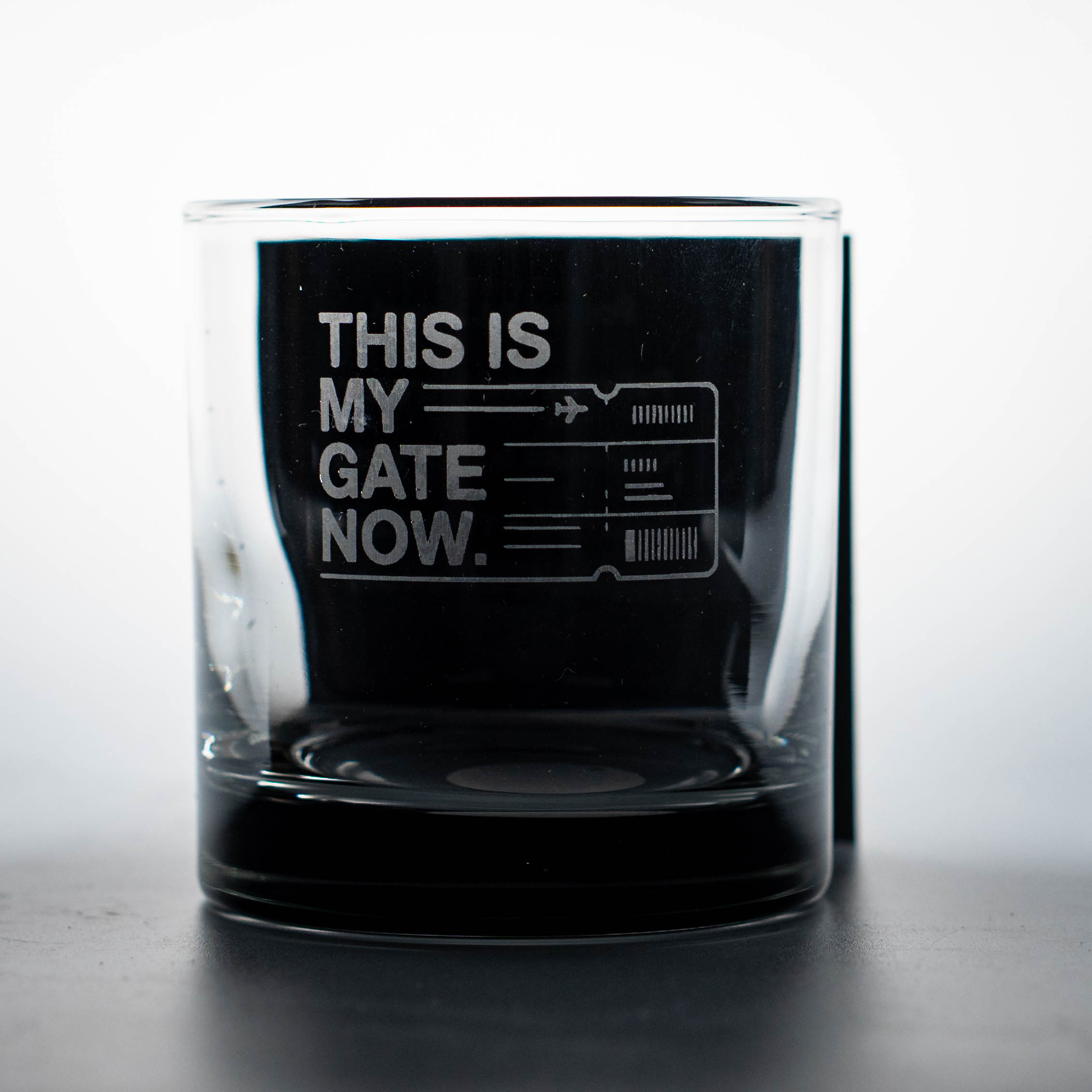 10 oz rocks glass with Final Pour Itinerary engraving. White laser engraving on clear glass.