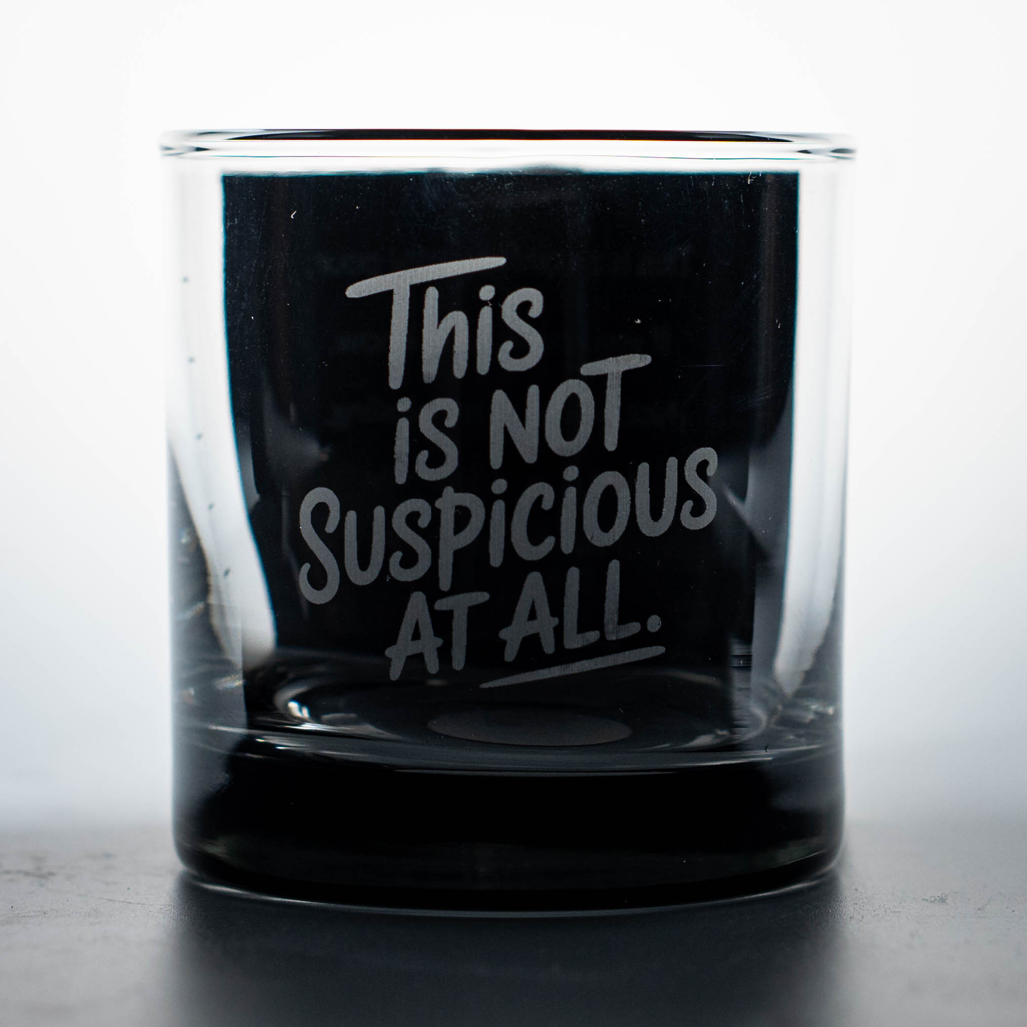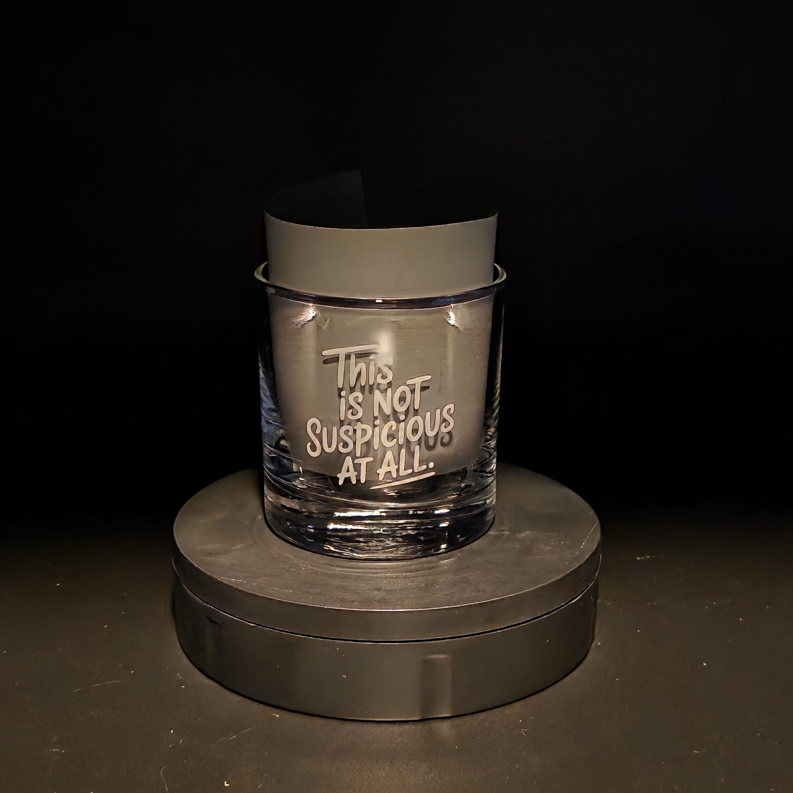 10 oz rocks glass with The Hidden Pour engraving. White laser engraving on clear glass.
