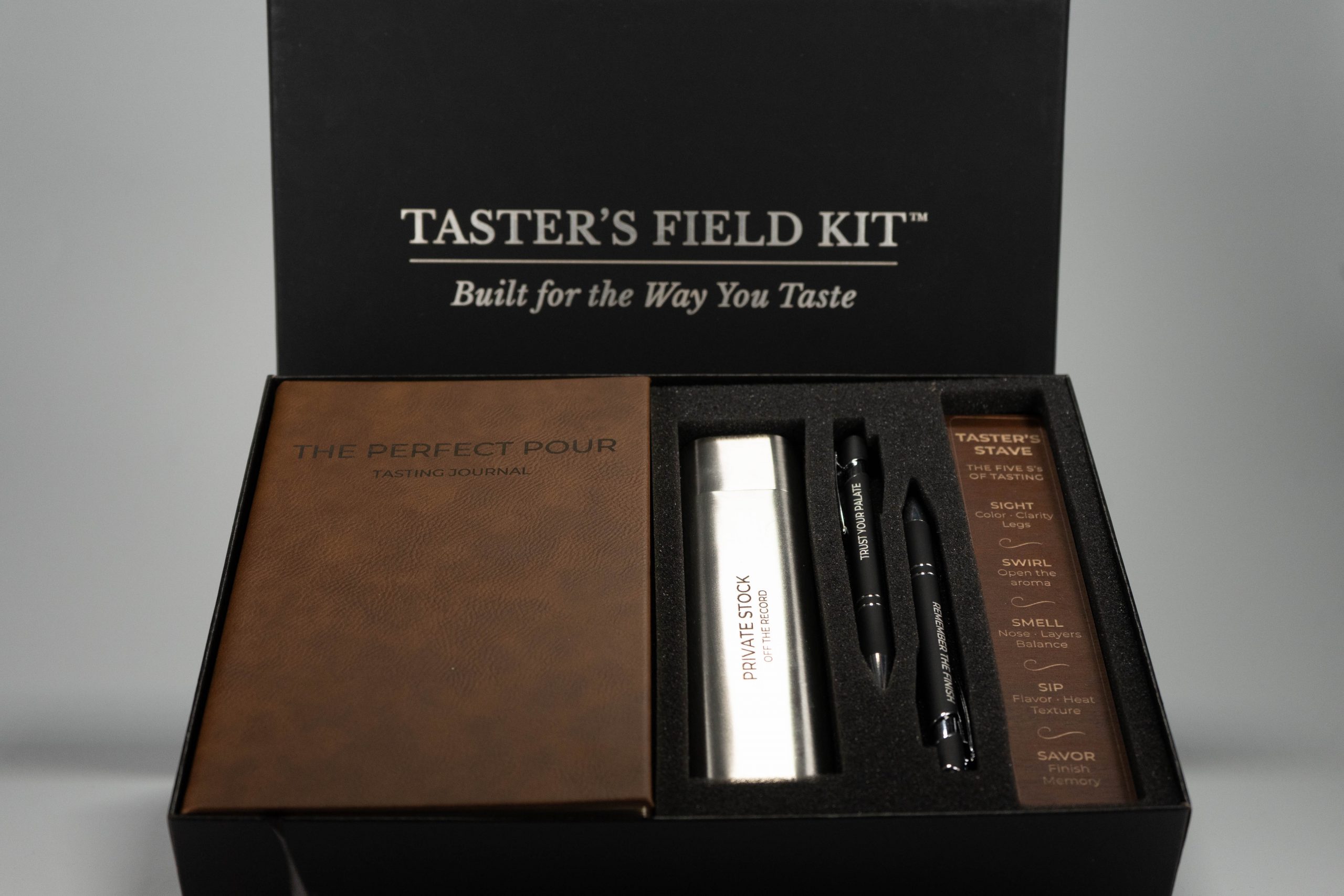 A guided whiskey tasting kit designed to slow the moment and sharpen the palate. The Taster’s Field Kit™ helps turn each pour into a record worth keeping. Designed and made by Major’s Mark. Key Features Complete guided tasting system Structured journal for long-term use Tasting wheel to support sensory language Designed for reflection, not scoring Elegant, giftable presentation
