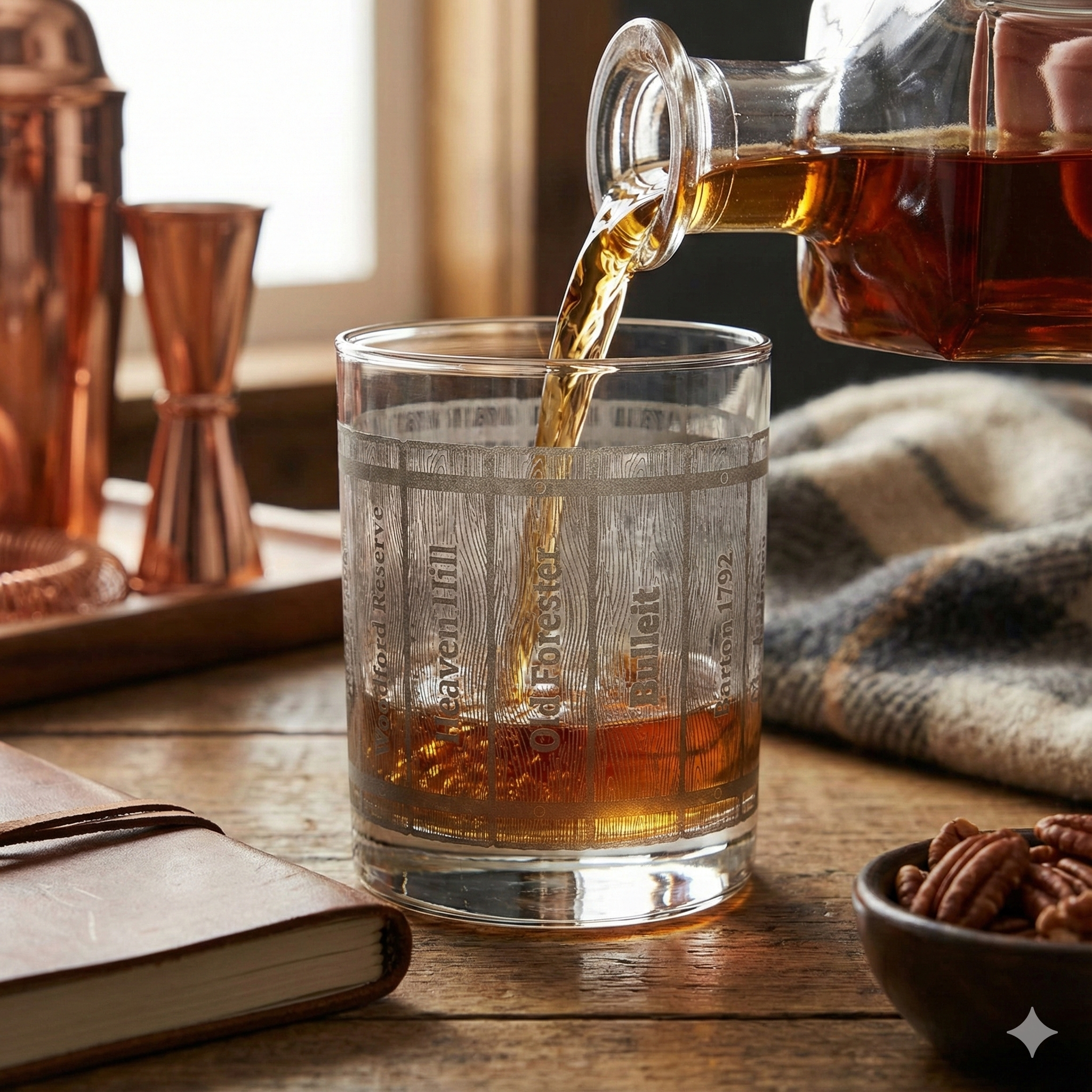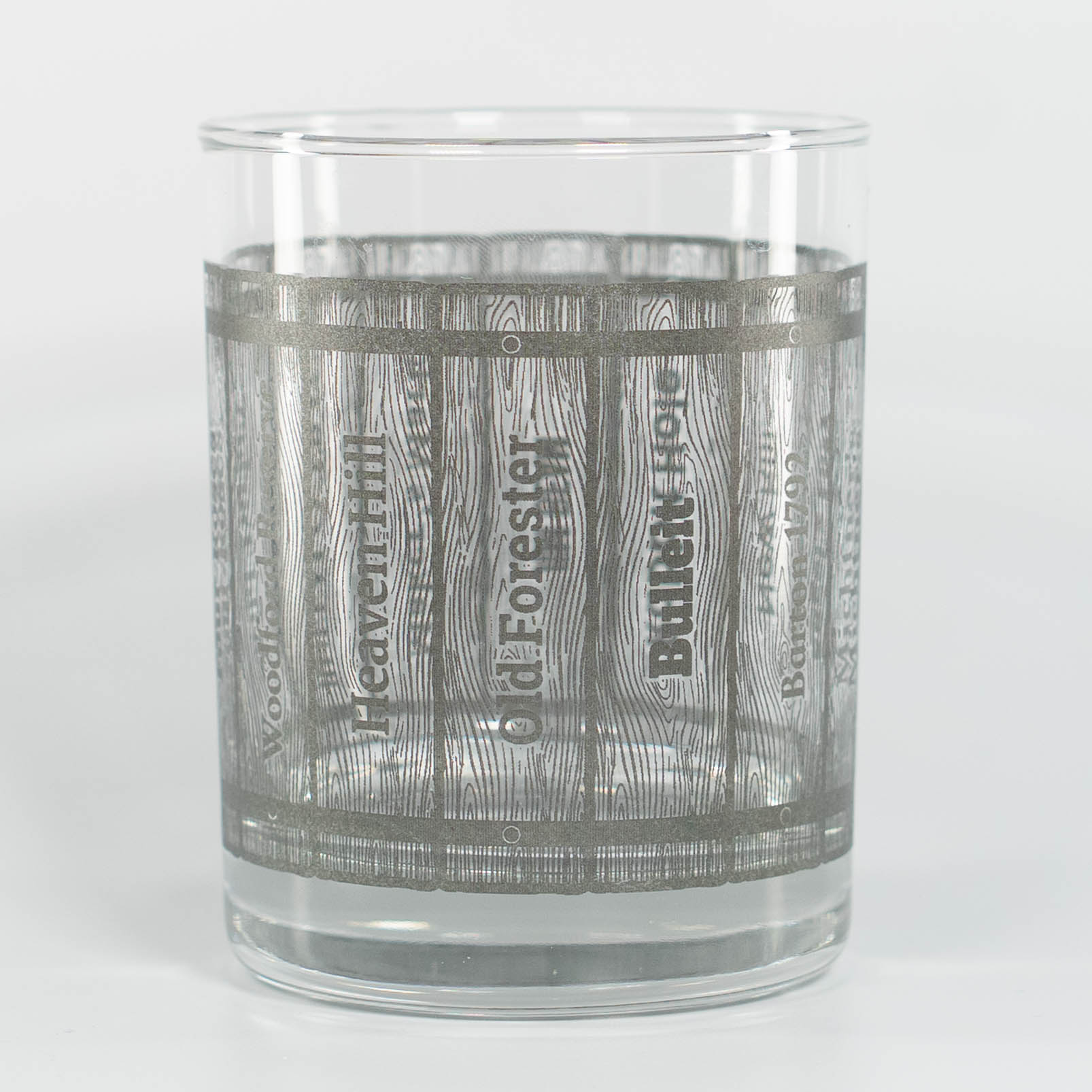 A classic whiskey glass engraved with American whiskey distilleries in a barrelhouse-style layout. Finished with black engraving for depth and contrast, designed for everyday pours.