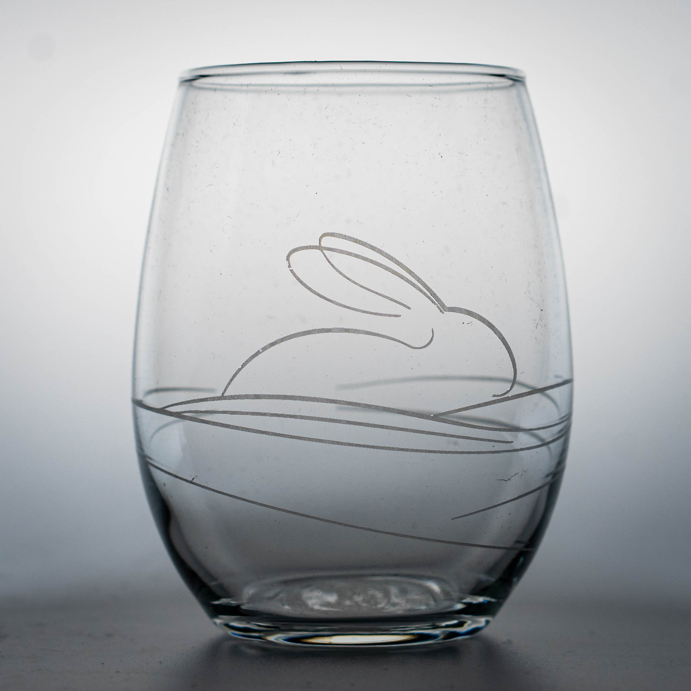 Single wine glass with Bunny Line Art and white engraving. Elegant modern look.
